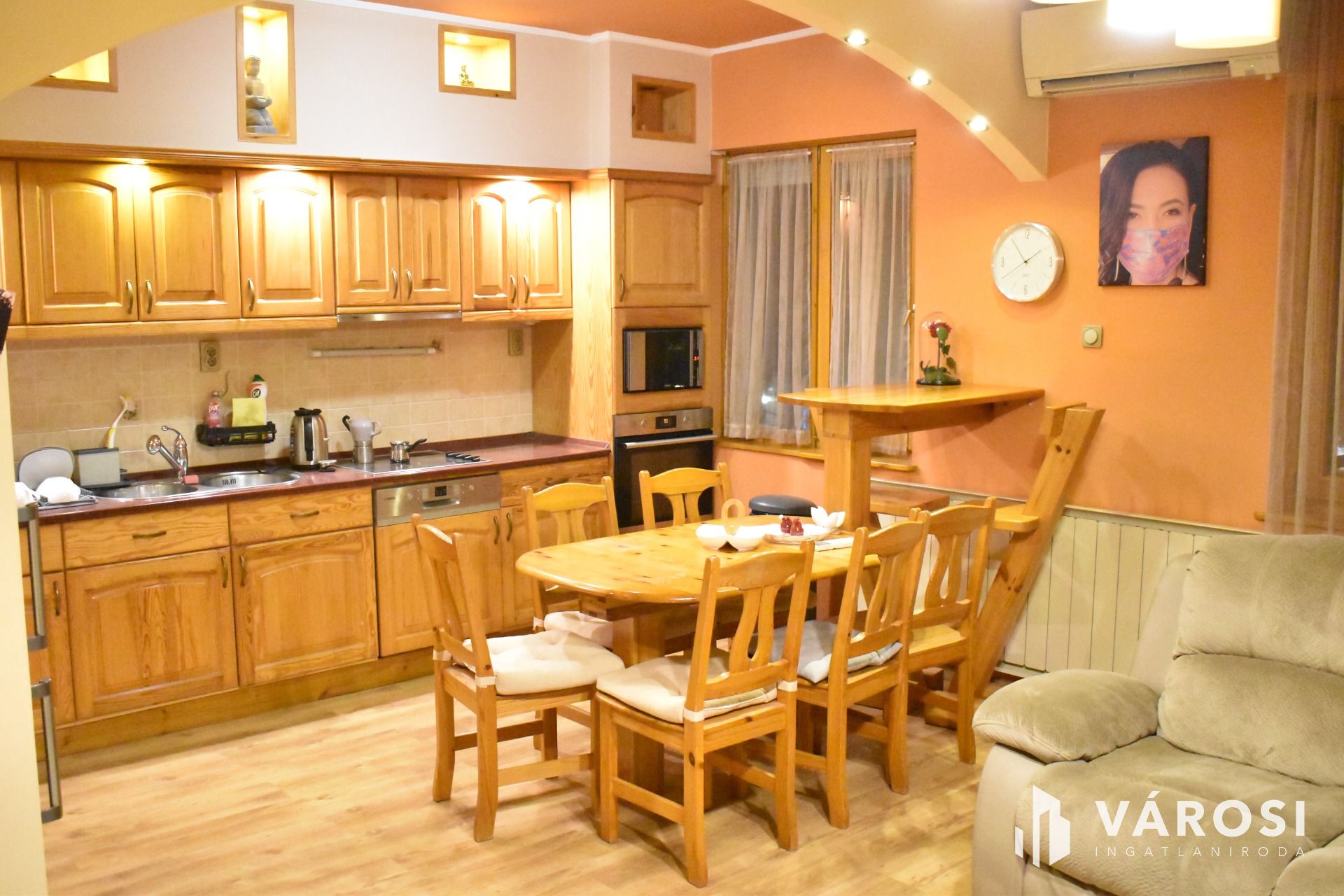Thanks to a unique redesign, the living room and kitchen are in one open space, featuring a beautiful kitchen with high-quality built-in appliances. During the renovation, several comfort features were installed, such as electric shutters and cost-efficient LED lighting.