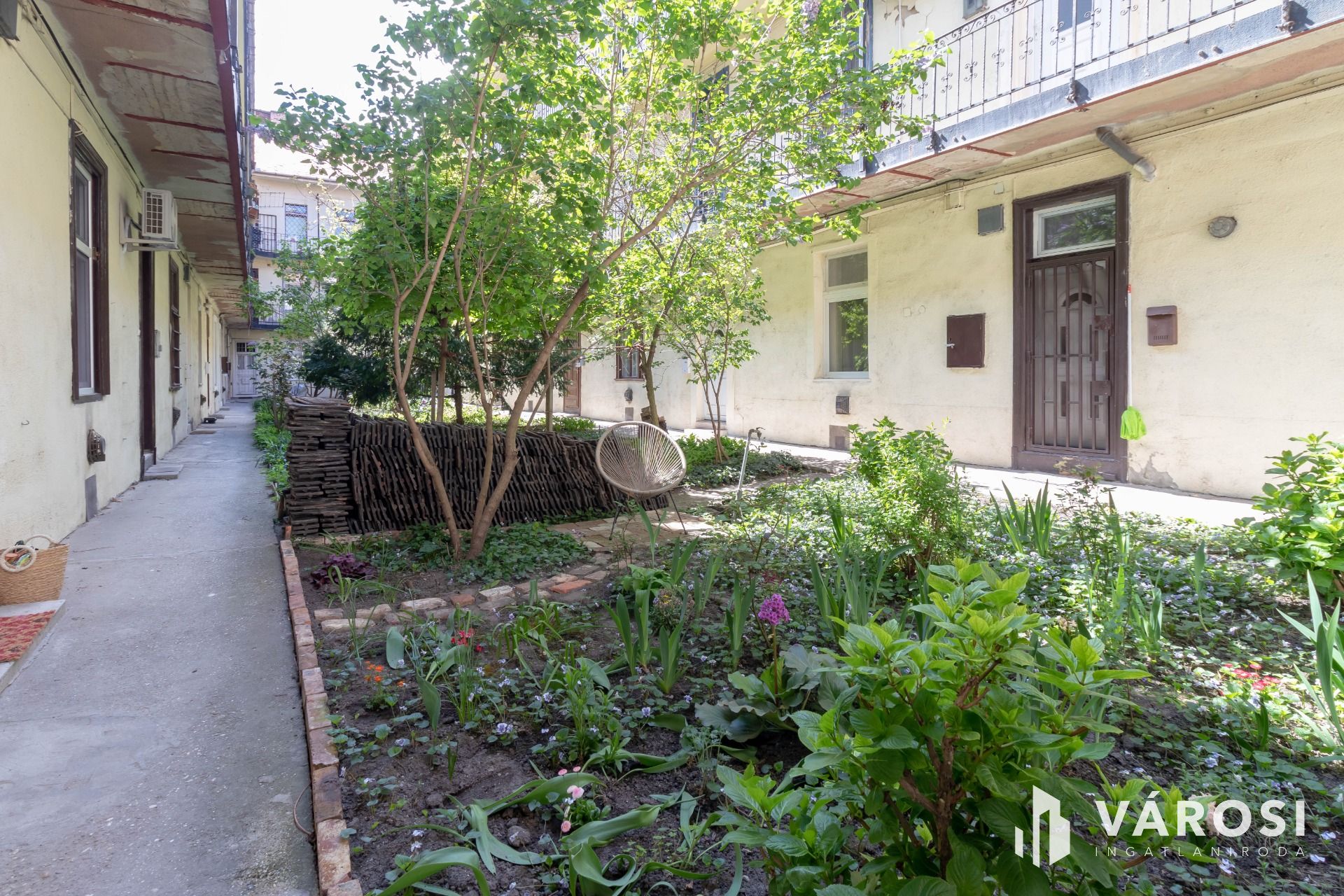 A lakás egy belső udvaros, 2 emeletes társasház földszintjén található. Az udvar rendben tartott, virágos, közös kerti csap is rendelkezésre áll.