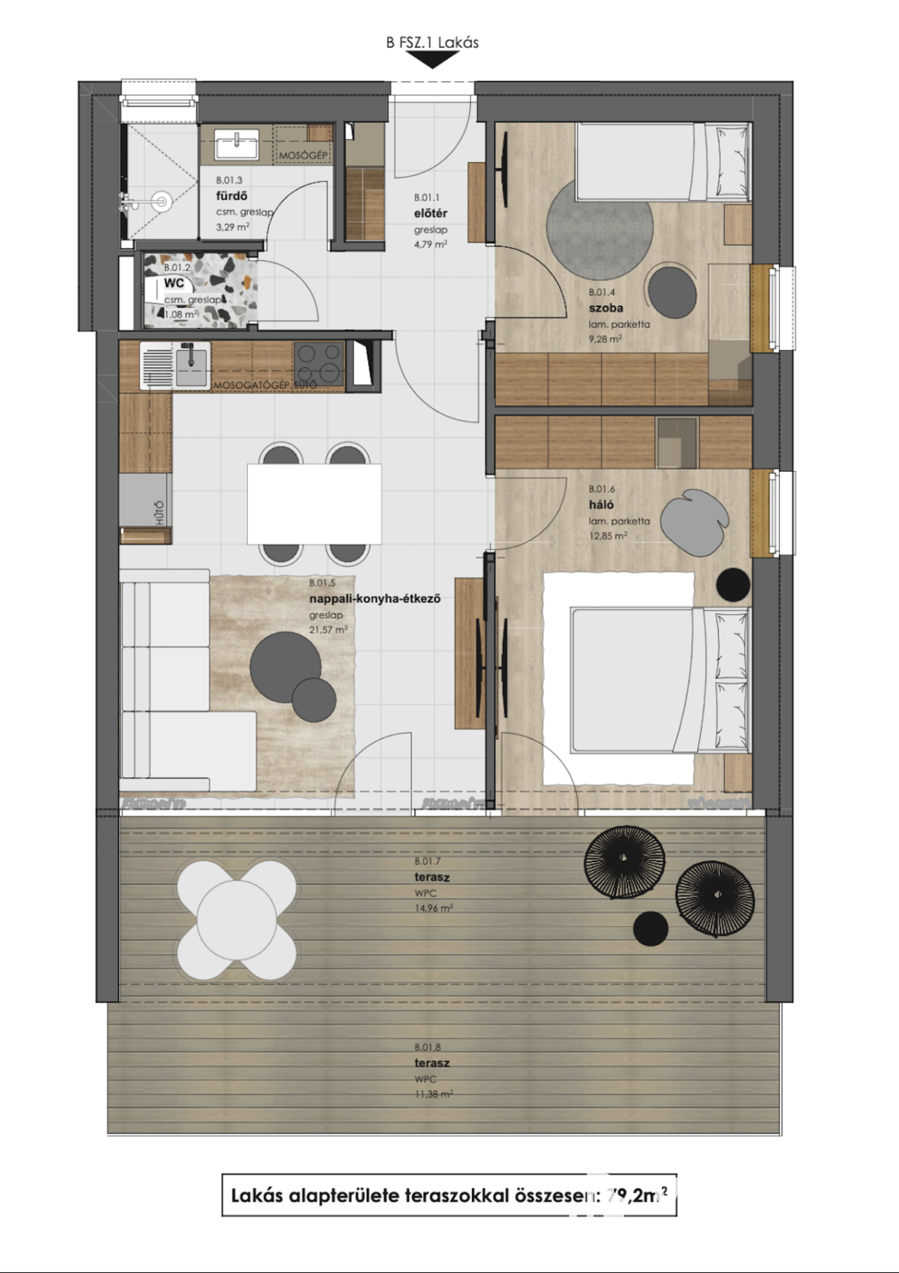 - Nappali–konyha–étkező: 21,57 m²