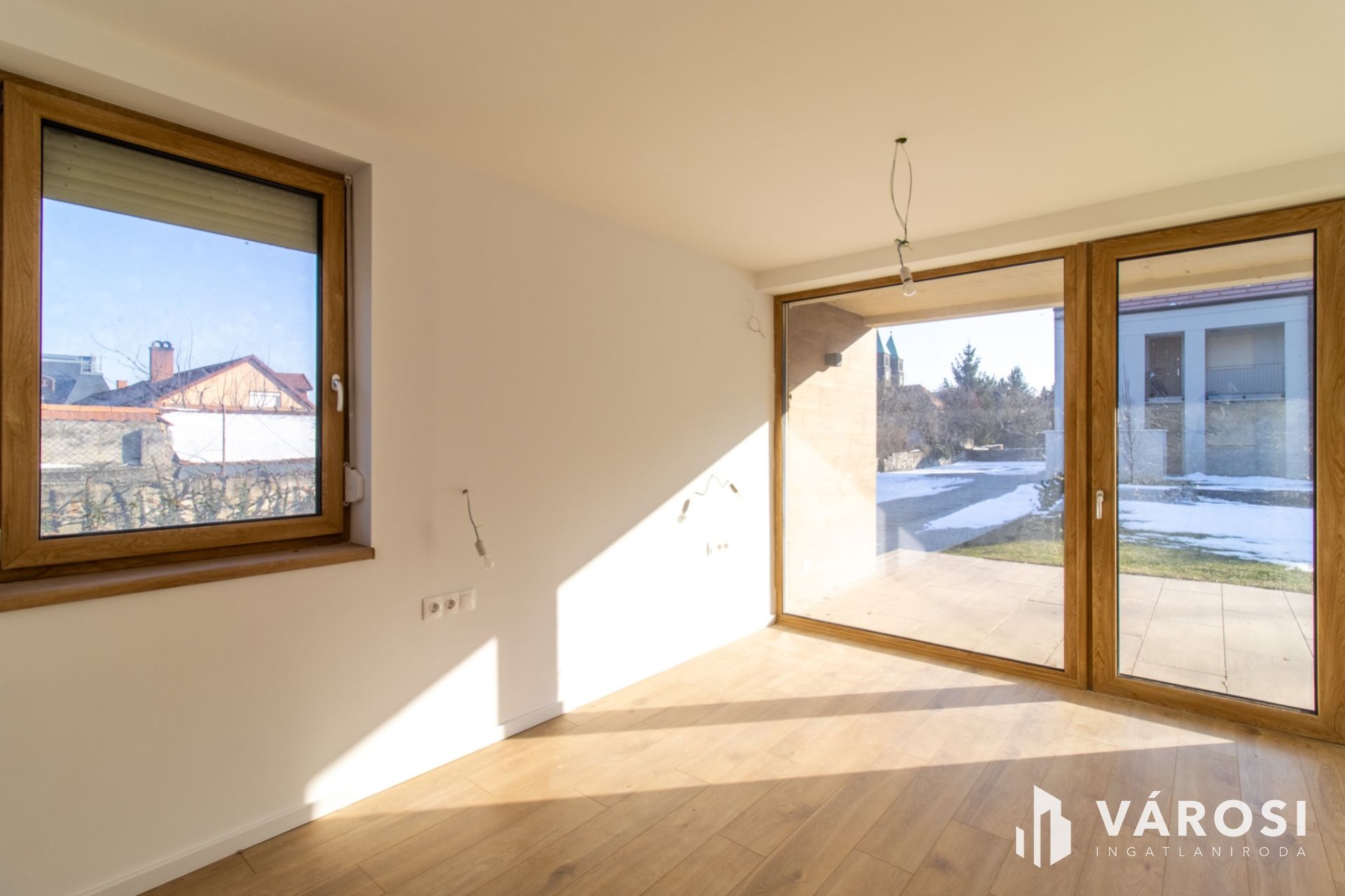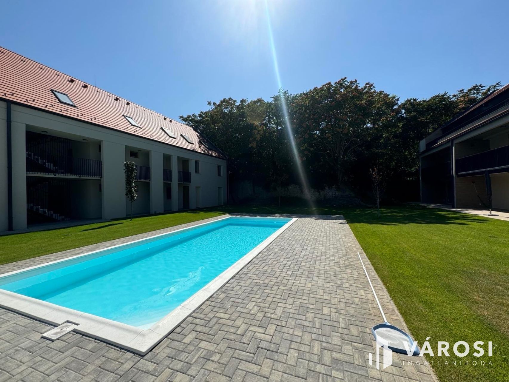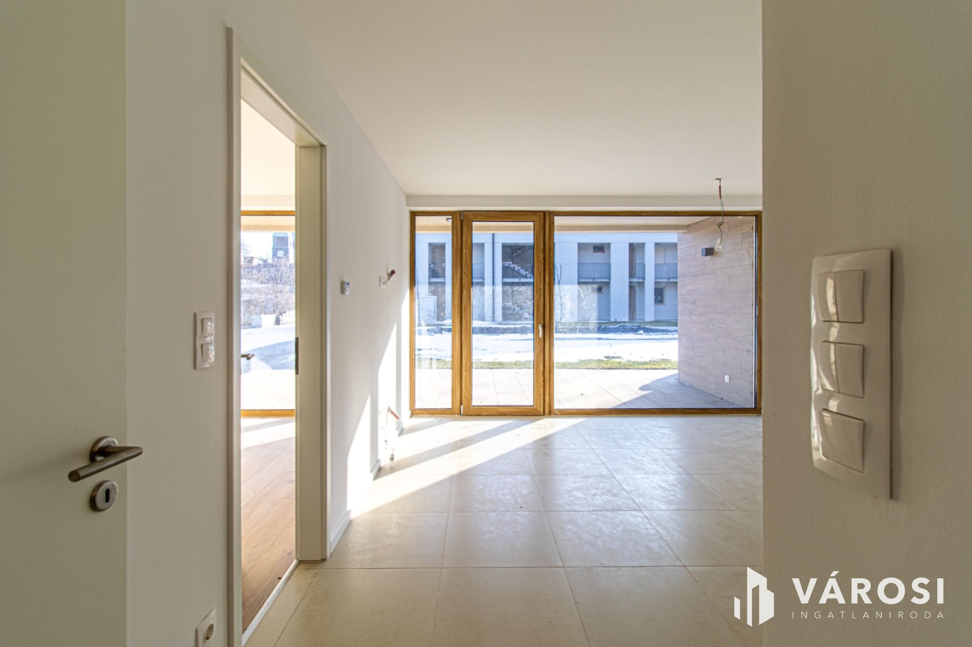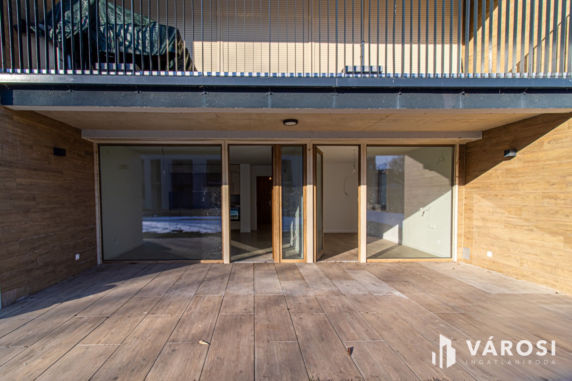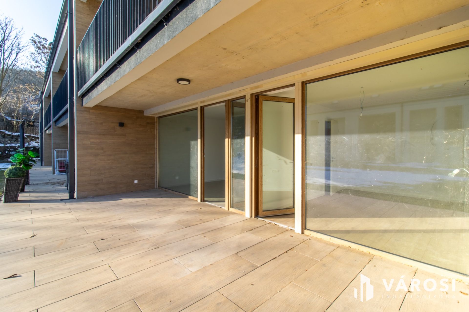A 66,7 m²-es lakótérhez egy impozáns, közel 27 m²-es, félig fedett terasz tartozik, amely közvetlenül a kerthez és a medencéhez kapcsolódik.