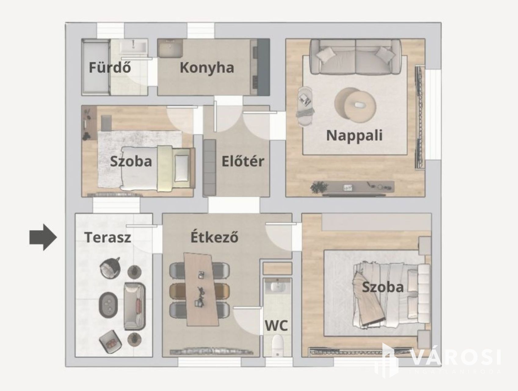 A belső elrendezés praktikus: külön fürdő és WC, jól bútorozható szobák.