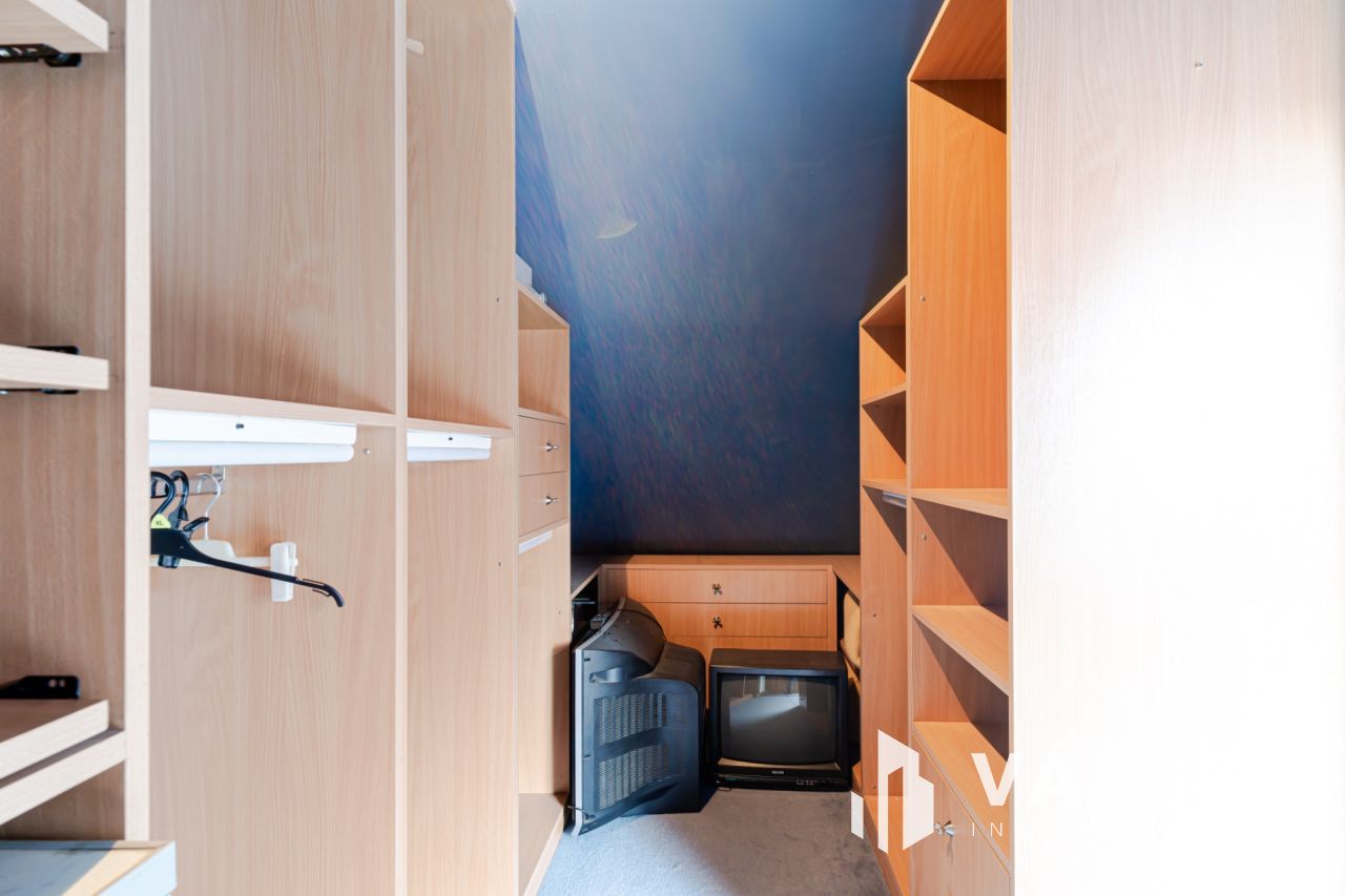 A nappaliból egy kényelmes lépcső vezet fel az emeletre, ahol egy egybenyitott, sokoldalúan alakítható tér található. Jelenleg egy hálórész, dolgozósarok és gardrób kapott itt helyet, de könnyedén két különálló szobává alakítható - tökéletes gyerekszobának vagy akár egy extra hálónak.