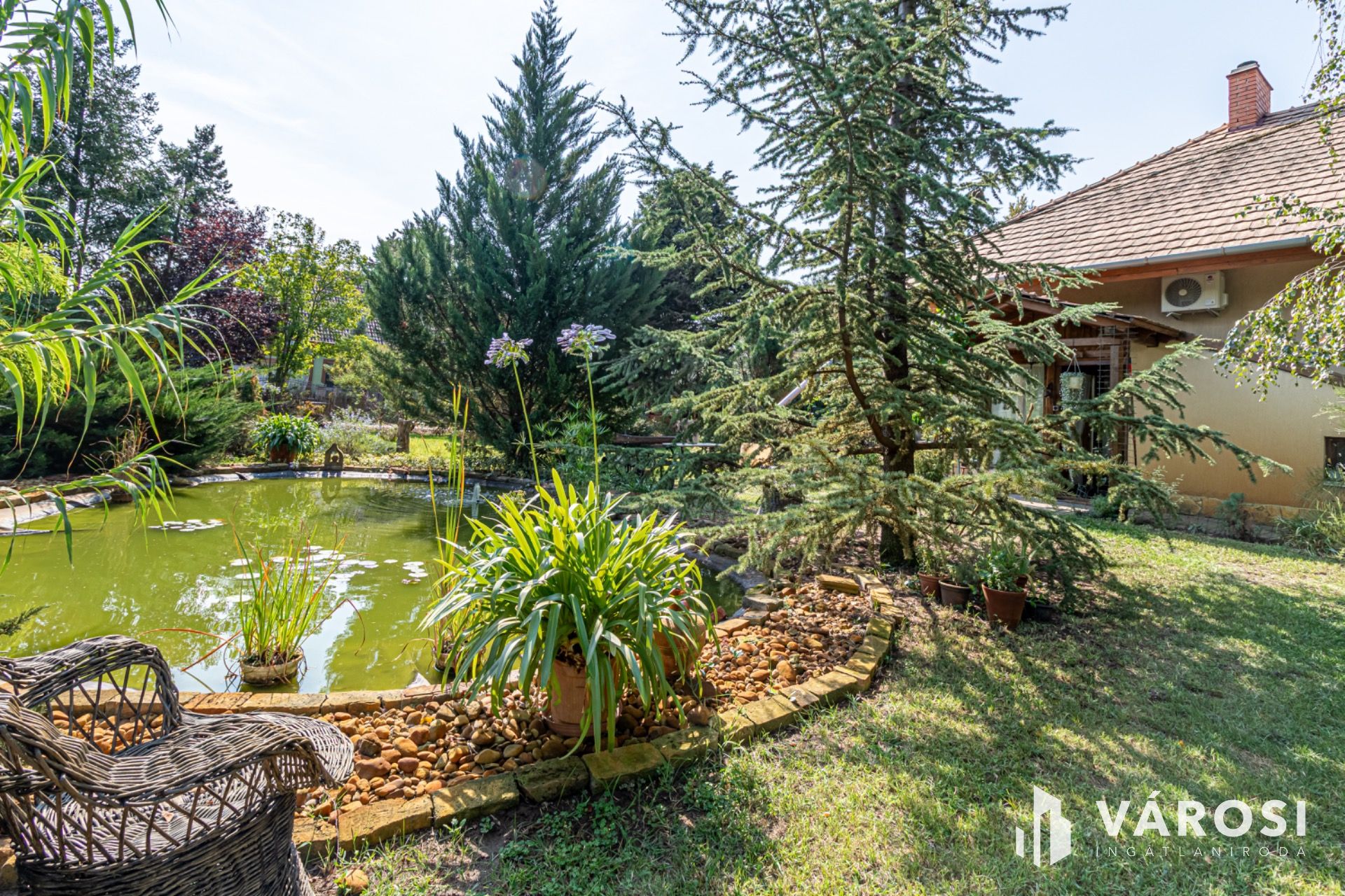 A házhoz tartozik egy gyönyörű terasz, ahol élvezheti a friss levegőt és a nyugodt környezetet. A gondozott kert igazi édenkert hangulatot áraszt: változatos és különleges növények, örökzöldek, valamint egy hangulatos kerti tó várja, amelyben aranyhalak úszkálnak, vízi liliomok és más dísznövények díszítik a környezetet.