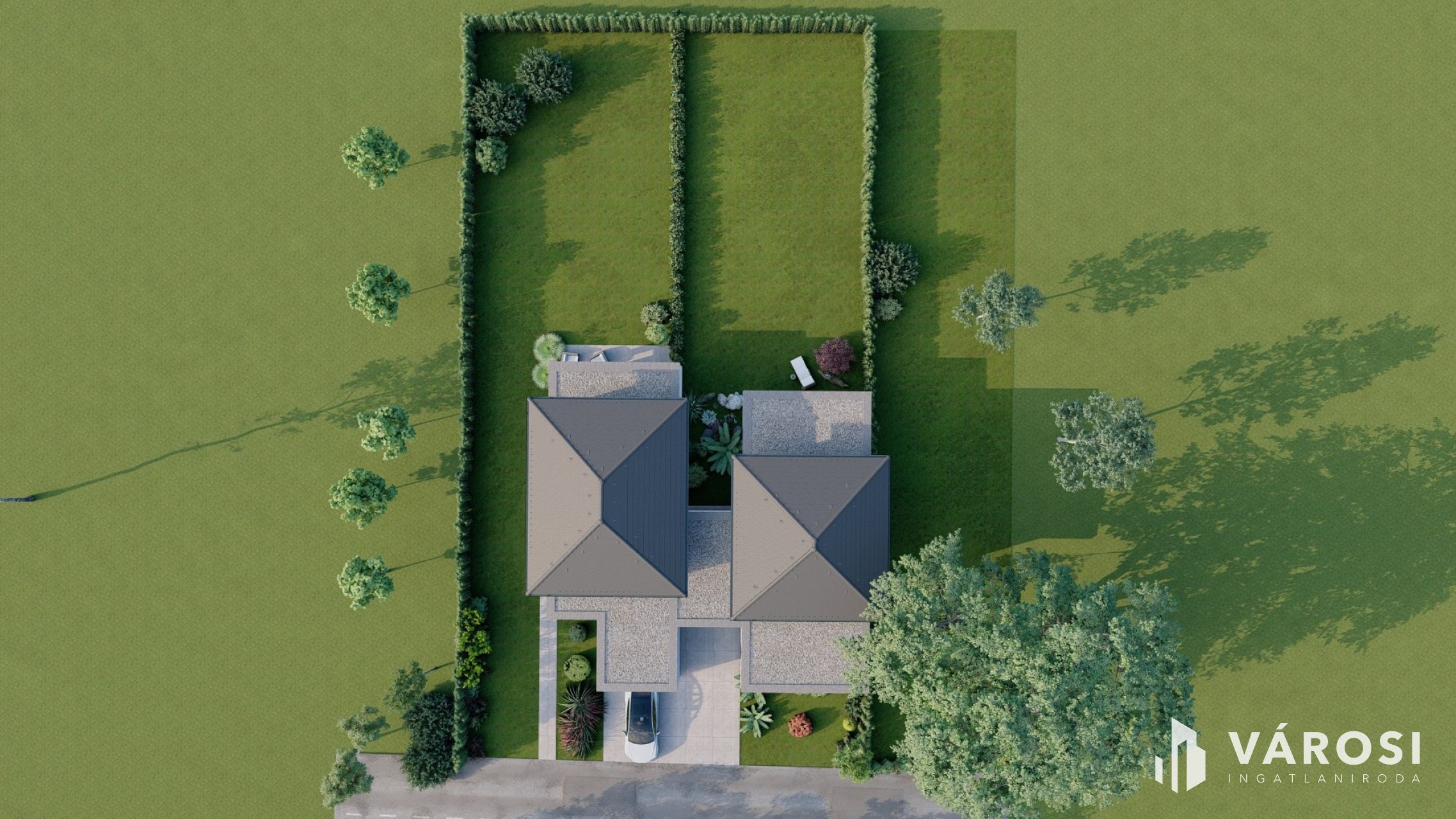 A 989m2-es telken ikerházas építkezés kezdődött meg, a belső kétszintes kialakítású házaknak nincs közös falazata, a két lakást fedett gépkocsibeálló köti össze, önálló bejárattal rendelkezik mindkettő az utcafrontról, így önálló házként funkcionálnak, a privát szféra garantált!